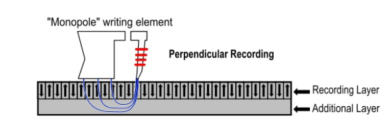 Certains disques aimantent ces blocs à la verticale, et d'autres à l'horizontale. Pour simplifier, les disques durs récents utilisent l'aimantation verticale. Cela permet de prendre moins de place pour stocker un bit, et donc d'avoir des disques durs contenant plus de données pour la même taille.