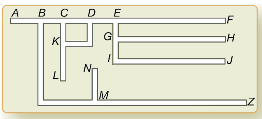 Les intersections sont les sommets du graphe et sont repérées par des lettres. Les couloirs sont les arrêtes.